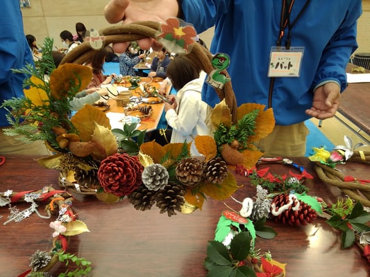今年のバスハイクは、11月12日(日)19組の親子で筑前町にある夜須高原記念の森にでかけました。気温が低く、あいにくの曇天でしたが、記念の森公園に到着すると大恐竜ヤスゴンがお出迎え。長い滑り台を含むアスレチックで思い思いに遊び、風に舞うフライングリングを追いかけたり子どもたちは元気いっぱい。余りの寒さに「やすらぎ荘」に移動し、体育館でボール投げなど続きの遊びで食事時間まで過ごしました。バーベキューは、職員の方が焼いてくださり熱々のお肉やジャガイモ、焼きそばなどを堪能しました。午後は体育館に用意された記念の森で採れた松ぼっくりなどを使ったリース作り。飾りの小物も各種あり職員さんのアドバイスのもと、熱心に取り組みました。屋上からの筑後平野の景色も壮大で、もう少し暖かい時に訪れたい緑豊かな場所でした。
