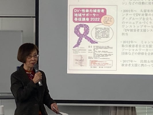 昼食休憩を挟んで、午後は、「DV被害者への支援 子どもへの影響と母子への支援」を甲木京子さんに、「母子家庭の当事者団体から生まれた拠点“じじっか”の取り組み」について一般社団法人umau.副代表の中村路子さんに講演していただきました。そして当事者の体験談の後、「相談事例検討と参加者交流」をグループに分かれて行いました。大変有意義な講座で今後も継続したいと思いました。