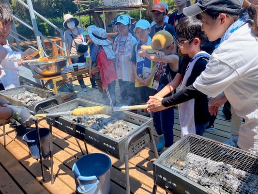 全員でバーベキューを楽しみました。好みの具材をトッピングした手作り石窯ピザにも挑戦。海辺の豊かな自然を満喫しながら、糸島産の新鮮な肉や野菜に舌鼓。食後は、「九州大学うみつなぎプロジェクト」の清野聡子九州大学准教授のレクチャーを受け、ビーチクリーンを行いました。台風で打ち上げられたゴミを集め、唐泊という地名の由来や、貴重な貝殻などについて海の環境の現状を学びました。